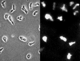 D. discoideumを使った場合、この条件で、ほとんどすべての細胞を標識することができる(図2).しかし、細胞の状態や微妙な実験条件の違いなどがエレクトロポレーション効率に影響するので、最適な条件を見つけなければならない.例えば、Polysphondyliumのように細胞が小さい時は、より厳しい条件が必要になる.以下の関係は条件を探す時の目安となる.穿孔の効率は,電圧,コンデンサ容量に大体比例し,液のコンダクタンスにほぼ逆比例する.例えば,液量を200 μl (深さ1 cm)にすると,コンダクタンスが増えるので,もう少し強い条件がいる.また、バッファーの組成もコンダクタンスに直接反映するのでエレクトロポレーションの条件に大きく影響する.つまりイオンが増えるほど強い条件が必要になる.
