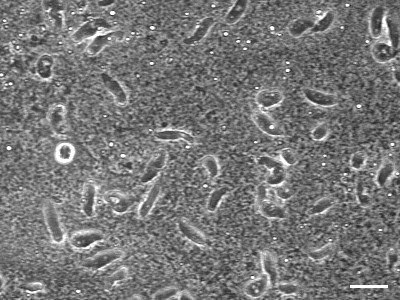 繊毛虫類は、水分の少ない寒天培地の上ではあまり形を変えない大きなアメーバのように見える。Scale bar = 50 μm(採集地:京都市)。 |