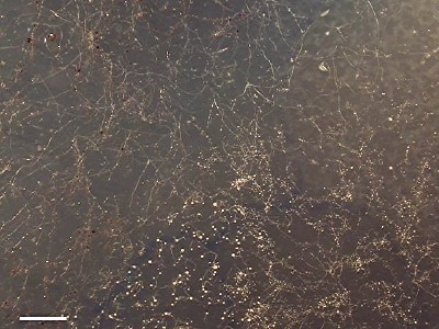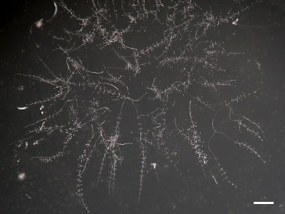 分離プレートの上で増殖するシロカビモドキ (P. pallidum) のコロニー。中央下寄りと右上隅に集合の流れの集まる所から移動体が伸びだしているのが見える。 左辺上方と中程、右下方には移動体が這っている。左上方と下方にかすかに茶色がかって見える白斑はカビ(糸状菌)のコロニー。 5日目のプレート。Scale bar = 2 mm(採集地:京都市)。 |