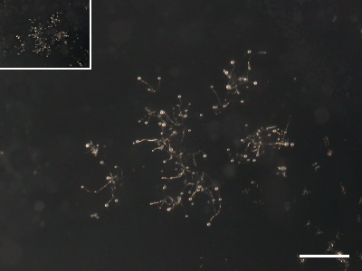 小型の細胞性粘菌 (D. minutum?)。このように小さな子実体しか作らない種は注意して探さないと見落とすおそれがある。 左上隅の写真は、左隣の写真と同縮尺で示したもの。5日目のプレート。Scale bar = 1 mm(採集地:京都市)。 |