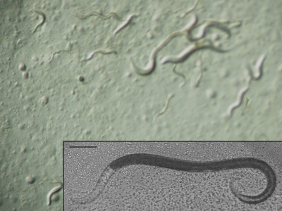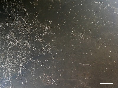 線虫にもよく出会う。下の写真の Scale bar = 0.1 mm(採集地:京都市)。 |