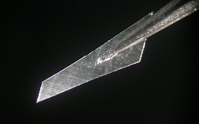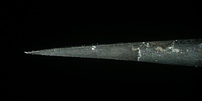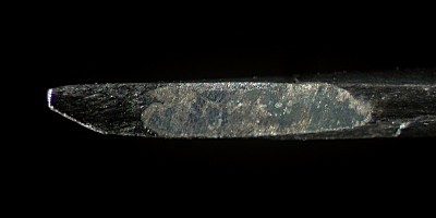木綿針を削って作ったナイフの側面と上面の写真.写真に見えている部分の長さは約 6 mm.
