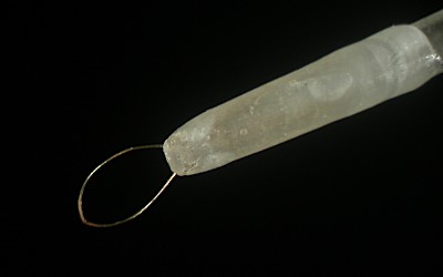 移動体などの組織の切断には,細い毛髪を輪にしてガラス管などの柄に固定したもの (ヘアループ,写真−上),ステンレスの針をグラインダーで削ってナイフ状にしたもの(写真−中),小さく切ったアルミホイルをピンセットなどで挟んだもの(写真−下),などが使われる.移動体などの組織をこわして混ぜ合わせるのには,ヘアループ,ステンレスの針、細く引いたガラス棒、睫を柄の先につけたもの、などが使われている.下の写真の道具の長さは約 12 cm - 14 cm. (写真はクリックで拡大)